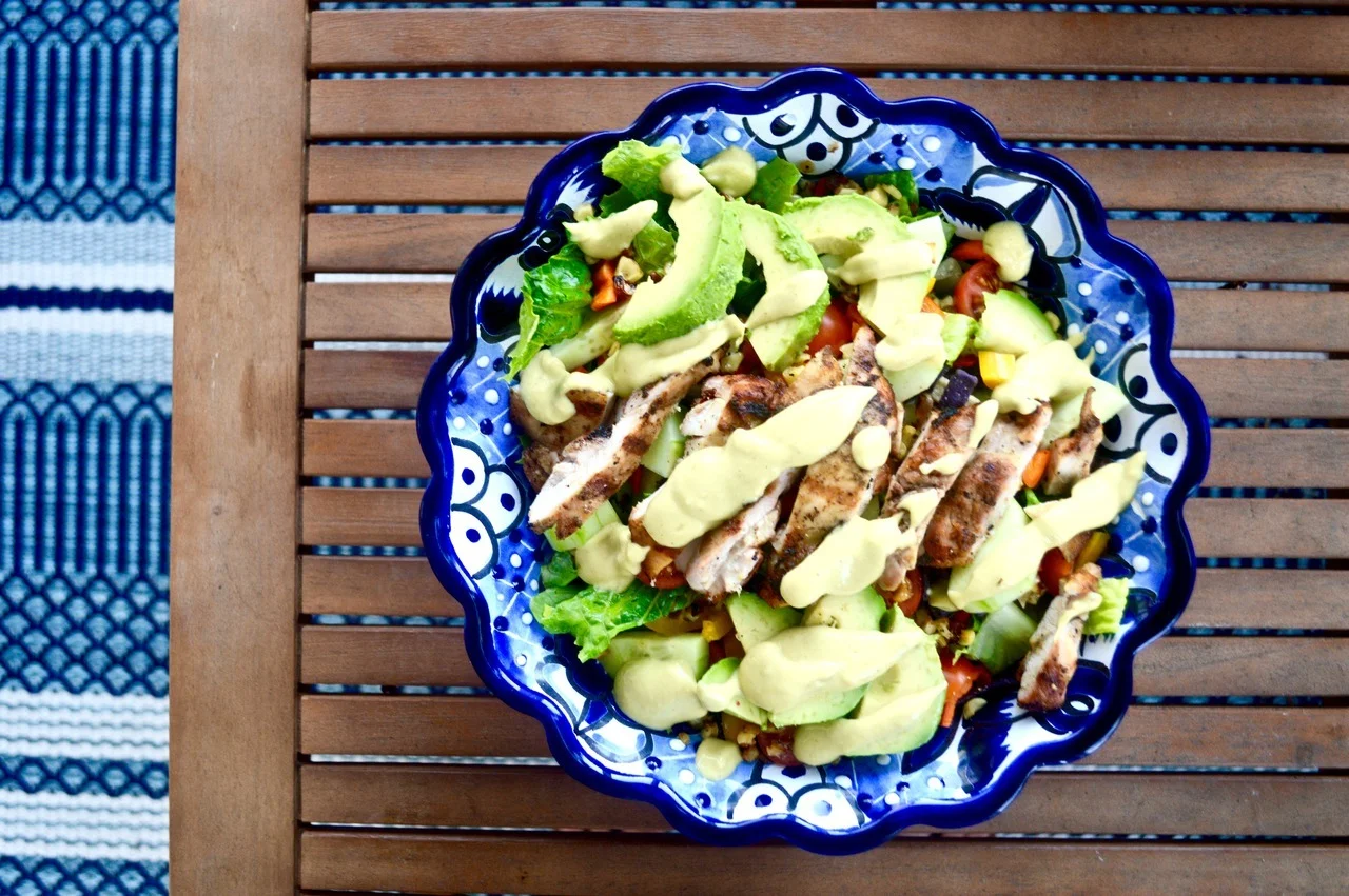 I started making this chicken in June before the weather had warmed up and it seriously gave me life until the summer finally arrived. It’s charred and spicy and wonderfully tender and can be made under the broiler (win for city-dwellers!) or on the grill. It’s so delicious I use it in everything from fajitas to grain bowls but honestly, it could easily stand on it’s own with a few veggie sides. I’ve been making it in heavy rotation the whole summer, and after perfecting a creamy avocado dressing, I couldn’t wait to share my salad version with you.